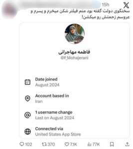 اما آنچه در سطح جهانی یک قابلیت امنیتی محسوب میشود، در اکوسیستم دیجیتال ایران به ابزاری برای راستیآزمایی ادعاهای سیاسی تبدیل شده است. با توجه به فیلترینگ گسترده شبکه اجتماعی ایکس در کشور، دسترسی کاربران عادی تنها از طریق ابزارهای تغییر آیپی (فیلترشکن) ممکن است. بنابراین، منطق فنی حکم میکند که در بخش موقعیت مکانی کاربران ساکن کشور، نام کشورهای خارجی درج شود یا در صورت استفاده از ابزارهای خاص، یک علامت تعجب (!) به نشانه عدم تشخیص دقیق موقعیت نمایش داده شود.